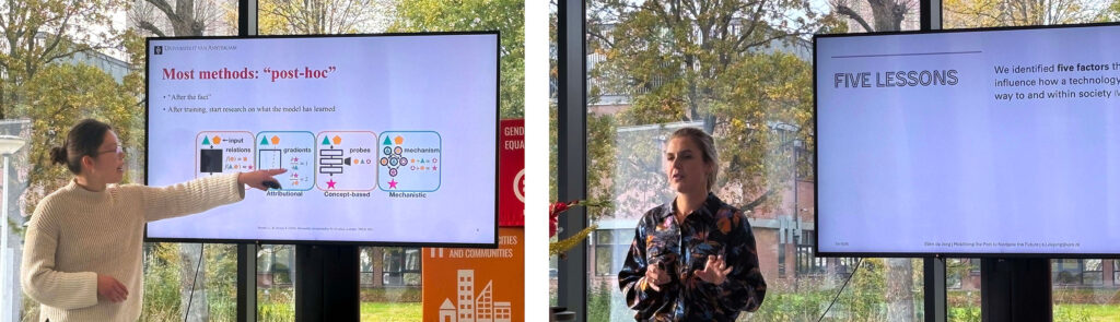 The afternoon session focused on societal themes. Evert van Nieuwenburg (Leiden University) opened with a presentation on how quantum games, such as Quantum Tic-Tac-Toe, can help people learn quantum principles. Eline de Jong (UvA) shared five lessons for embedding new technologies in society, suggesting they apply to quantum tech as well. Angela van Sprang (UvA, ILLC) presented concept-bottleneck models as tools for improved AI oversight, and Matteo Fabbri (UvA) argued for proactive standards for recommender systems and other emerging technologies. In the panel discussion, led by Zuidema, participants from both AI and quantum backgrounds reflected on responsible innovation and the risks and opportunities of uncertain technological futures.